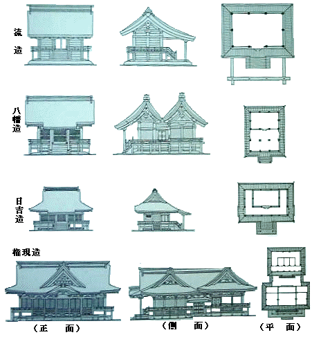 神明造は、白木の建物に干してある稲わらの形を模した屋根を被せた物で、これが神社の正式な様式だと思われる。
